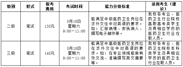 本次考试采取网上报名缴费方式,具体详情可登陆医护英语水平考试官网或关注医护英语水平考试公众号完成网上信息填报及报名。