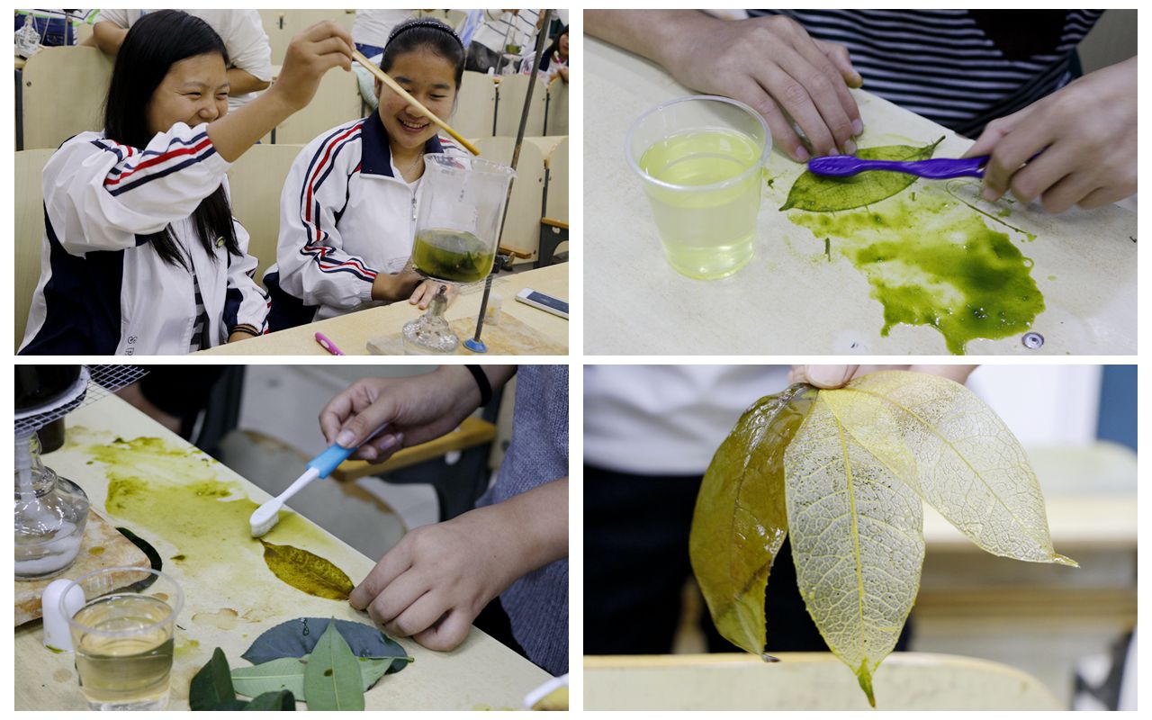 活动伊始,大家在事先准备好的叶子中先挑选出自己喜欢的形状,在试验站技术人员的指导下,依据叶脉书签的制作方法,先按比例配置好试剂,蒸煮树叶,用牙刷剔除叶肉,沥去水滴,稍干后压平。每一道工序都被做得认真仔细。