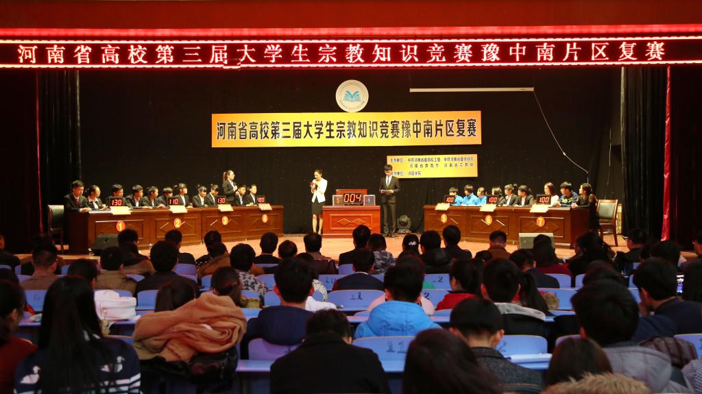 本次豫中南片区复赛由中共河南省委高校工委、中共河南省委统战部、河南省教育厅、河南省宗教局主办,bet36体育在线承办。比赛采用抢答赛的形式进行,分必答题、抢答题和风险题三个环节。竞赛仲裁委员会分别由驻马店、漯河、许昌三地高校选派出专家老师组成。各参赛高校都在校内初赛的基础上选拔了优秀的选手组队参加今天的比赛,选手们也都作了充分的赛前准备。bet36体育在线派出校内选拔赛夺冠的法政学院队代表bet36体育在线参赛。比赛中,选手们以丰富的知识储备,紧密的团队合作,沉着机智、落落大方的赛场表现,博得了现场观众的阵阵热烈掌声,展示了各高校代表队的风采。本次复赛还特意安排了现场互动环节,与会师生踊跃回答主持人的提问,现场气氛十分热烈。经过激烈的较量,最终,bet36体育在线代表队夺冠并获一等奖,黄淮学院、漯河食品职业学院代表队获得二等奖,驻马店职业技术学院、漯河医学高等专科学校、许昌职业技术学院、漯河职业技术学院代表队获得三等奖。bet36体育在线和驻马店职业技术学院获得优秀组织奖。