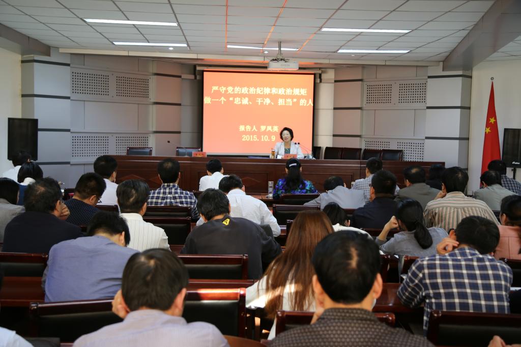 10月9日下午,机关党总支特邀纪委书记罗凤英为机关全体党员、科级以上干部做了题为《严守党的政治纪律和政治规矩,做一个“忠诚、干净、担当的人”》的专题报告。这次会议既是对“三严三实”专题教育的一次学习辅导活动,也标志着机关党总支“反腐倡廉教育月”活动正式启动。会议在办公楼第三会议室举行,机关党总支书记崔凤巧主持会议。