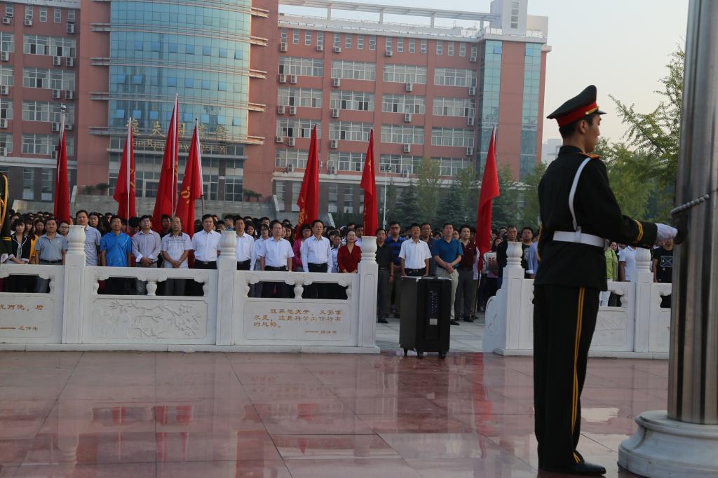 党委副书记马超指出,我们在抗战胜利70周年之际举行新学期升旗仪式,就是要引导广大师生铭记历史、缅怀先烈、珍爱和平、开创未来,将伟大的抗战精神转化为实现中华民族伟大复兴的强大精神动力,坚定理想信念,铸造坚强意志和品格,为实现中华民族的伟大复兴不懈奋斗。(摄影:宁智沛)