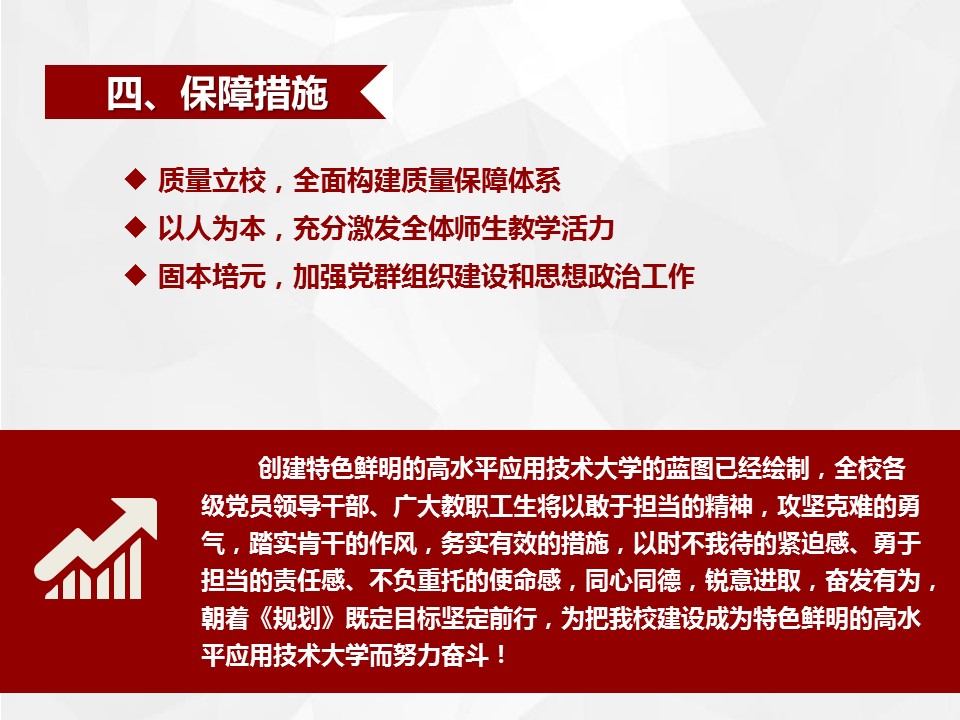 总规划明确提出今后五年的发展战略是“坚持四个统一、完善四项基本建设、实现四个突破、形成四大特色”,基本完成“三基一体”的建设任务,即五年内把学校建设成为高层次应用型人才培养基地、政产学研协同创新基地、先进技术转移与服务基地和高等教育、职业教育、继续教育有机联合体。实现发展战略的载体是“河南省示范性应用技术类型本科院校”建设和国家级“十三五”“产教融合发展工程应用型本科院校”建设。五年内事业发展的战略目标是初步建成以培养高层次应用型人才为核心,与区域重点产业、主导产业、特色产业和区域文化高度融合,特色鲜明的高水平应用技术大学。