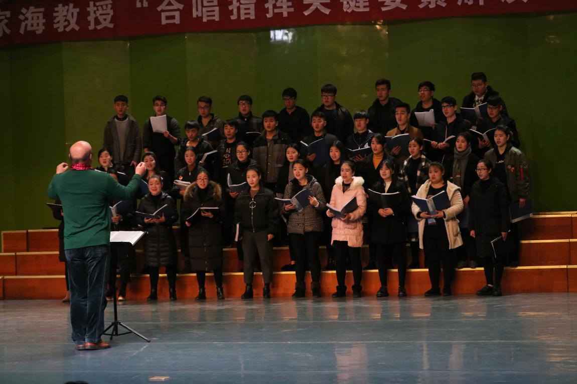 本场讲座分为学术报告和指导合唱团实践排练两部分。在学术报告中,陈家海教授基于我省高校音乐教育现状,全面分析了当前音乐教育的发展趋势,并结合自己从教生涯的经验,就合唱指挥专业的重要性、怎样把握关键要素学习好合唱指挥等问题进行详细解读,并强调了音乐专业要重点培养学生的应用实践技能,从而适应和满足社会对音乐人才的各种需求。