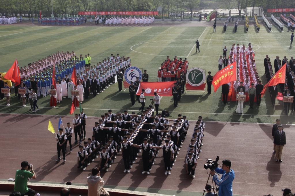 上午8时,伴随着雄壮激越的《运动员进行曲》,全体裁判员、运动员在校旗、运动会会徽和彩旗方队的引导下入场。