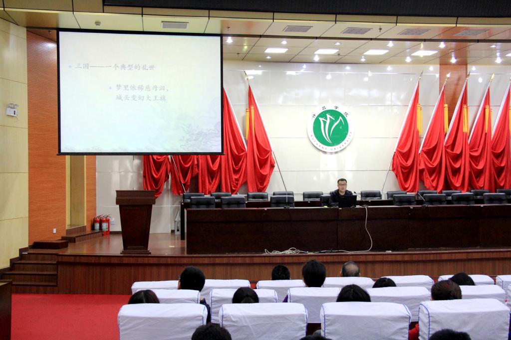 4月11日下午,许昌第十一届三国文化旅游周之曹魏文化讲坛在bet36体育在线学术报告厅举行,bet36体育在线旅游(历史文化)学院刘承博士为作了题为“一代雄主曹操的多面人生”的报告。bet36体育在线及许昌市职业技术学院300余名师生聆听了报告。