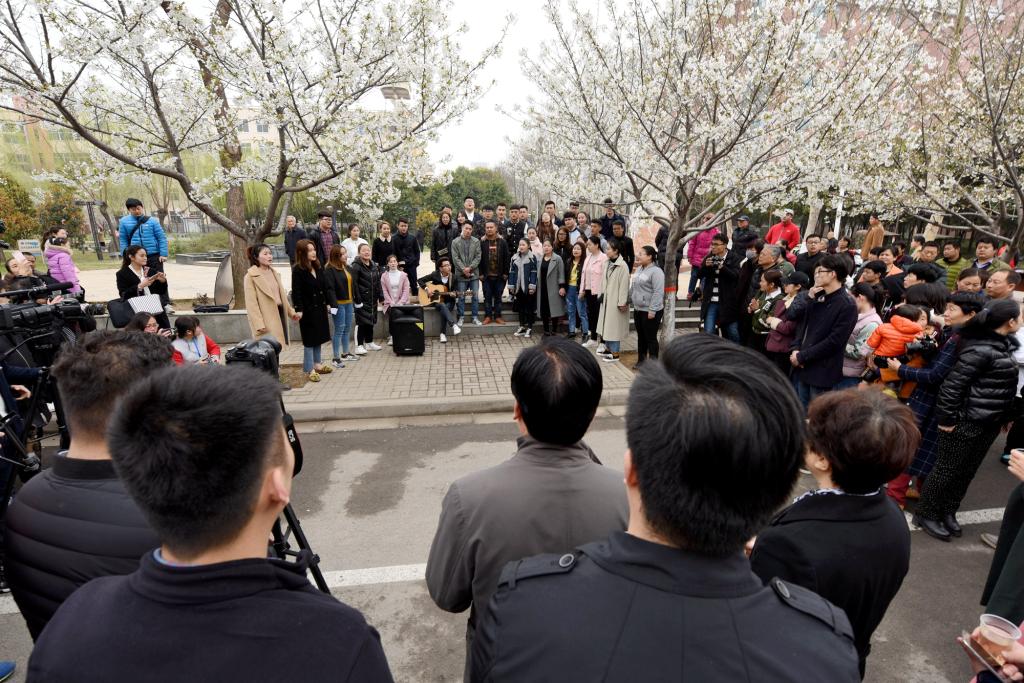 开幕式结束后,校领导和广大游客、师生们一同观赏了汉服礼仪展示、樱花茶艺、青春快闪、无伴奏合唱等文化活动。(摄影:宁智沛)