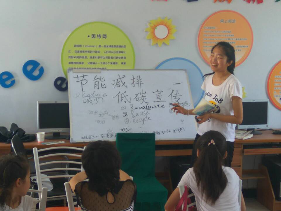 6月9日上午,外国语学院志愿者赴毓秀社区,以“低碳环保,绿色出行”为主题,开展节能减排宣传教育活动和支教活动。志愿者一对一辅导孩子们功课,外教莫妮卡教大家读写英语单词,用一些简单的短语和句子交流,激发孩子们学习英语的好奇心与求知欲。志愿者们还教学生学习关于绿色环保的英语词汇,学习环保知识,一起利用废报纸,废瓶子等制作小的工艺品,实现废物利用、绿色共享。