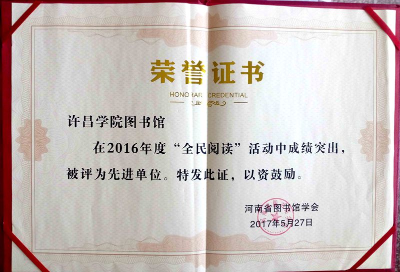 近日,河南省2016年度全民阅读活动先进单位评选结果揭晓,bet36体育在线图书馆再次被河南省图书馆学会授予“2016年度全民阅读先进单位”荣誉称号,这已是bet36体育在线图书馆第八次获得此项荣誉。