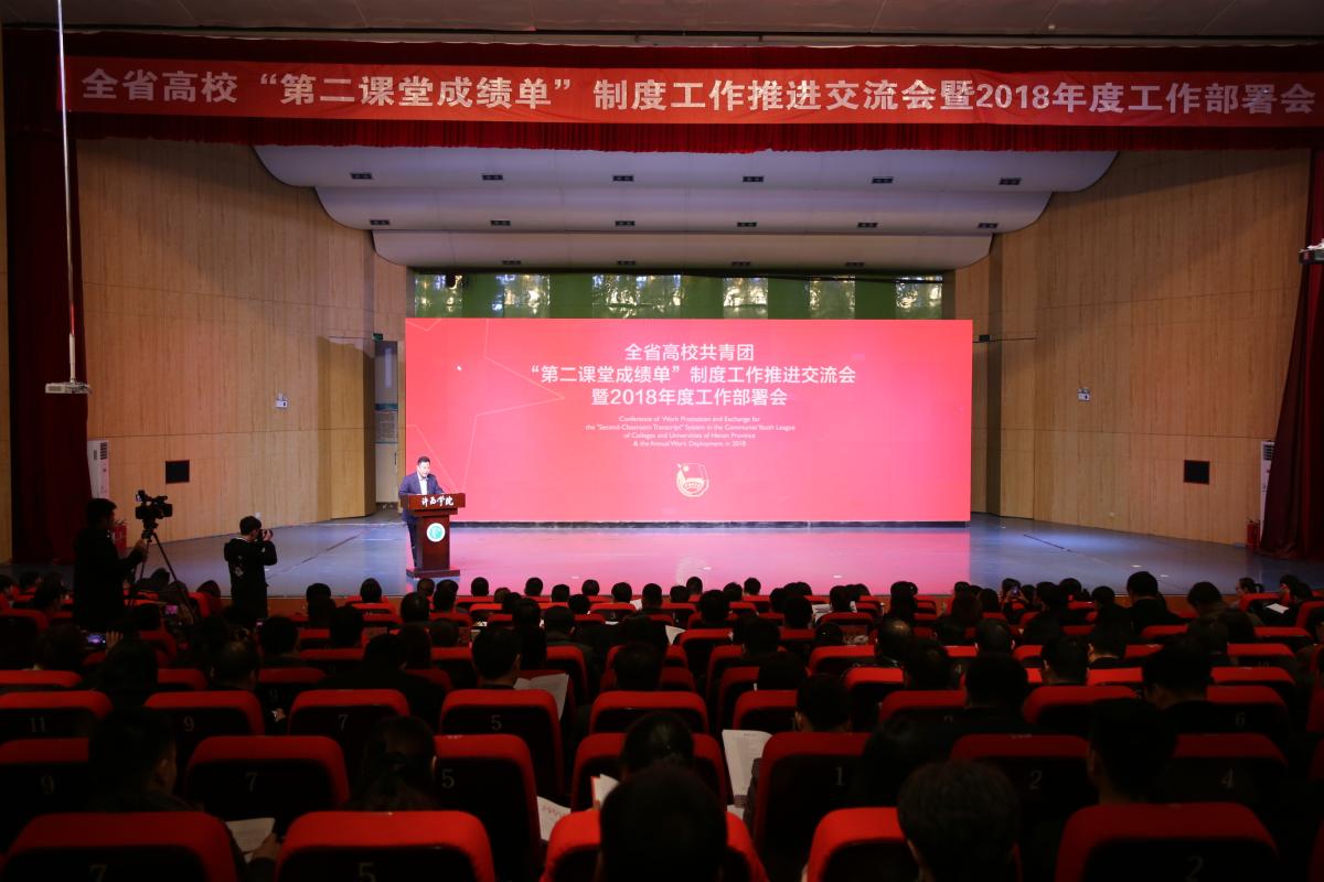 3月9日,全省高校共青团“第二课堂成绩单”制度工作推进交流会暨2018年度工作部署会在bet36体育在线成功举办。共青团河南省委副书记王笃波、全国学校共青团研究中心活动部部长马海、bet36体育在线学校党委副书记孙海、副院长黄怡俐,共青团许昌市委书记陈涛、PU口袋校园副总经理郑岚出席会议,南京工业大学、河北建材职业技术学院、山东工商学院等高校相关负责人,全省高校团委书记及“第二课堂成绩单”制度相关负责老师,bet36体育在线相关职能部门负责人共计300余人参加会议。