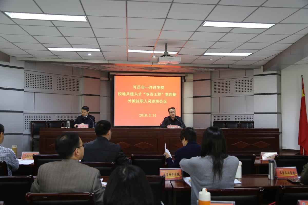 3月14日,许昌市-bet36体育在线校地共建人才“双百工程”第四批外派挂职人员述职会议在办公楼第三会议室召开。bet36体育在线纪委书记罗凤英、许昌市委组织部人才工作科科长黄海军出席会议,校党委组织部、党委宣传部、教务处、科技处、人事处、学科建设办公室、校地合作办公室等职能部门负责人,“双百工程”第四批外派挂职人员所在单位负责人,作为述职考核评委参加会议。“双百工程”第五批20名拟外派挂职人员也参加了述职会。会议由bet36体育在线党委组织部部长陈遂德主持。
