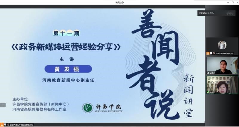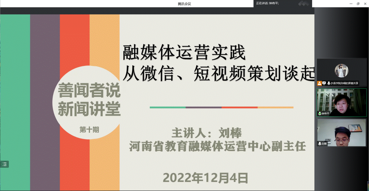 近日,由学校党委宣传部(新闻中心)主办、河南省高校网络教育名师工作室承办的第10期、第11期“善闻者说”新闻讲堂在腾讯会议网络平台上开展,活动特邀河南省教育融媒体运营中心副主任刘棒、河南教育新闻中心副主任黄发强为bet36体育在线师生作专题讲座。学校各单位新媒体宣传队伍、校媒团队、网络文化工作室指导教师及学生骨干共约600人次参与学习。
