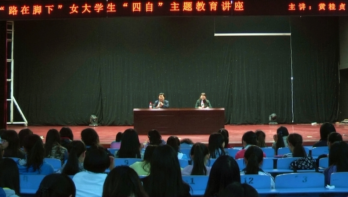 4月16日晚上,由校学生处主办、美术学院承办,女大学生“四自”专题讲座在校大学生活动中心顺利举行。bet36体育在线前党委副书记、现校关工委副主任黄桂贞做了题为《路在脚下》的专题报告。
