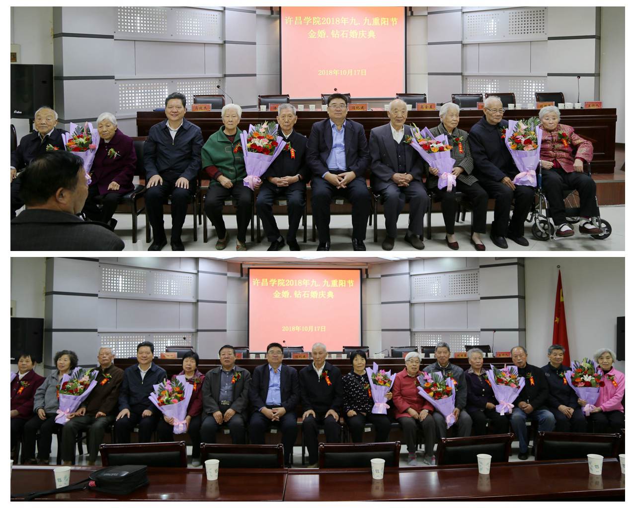 岁岁重阳,今又重阳。10月17日上午,在传统敬老节日—重阳节来临之际,bet36体育在线在第三会议室举行了2018年“九九重阳节”茶话会暨金婚钻石婚庆典。校党委书记闫纪建、校工会主席高金星出席庆典,党政办公室、党委组织部、离退休工作处负责同志和13对金婚钻石婚伉俪、百余名离退休老同志参加庆典。茶话会和金婚钻石婚庆典由离退休工作处党总支书记马廷杰主持。