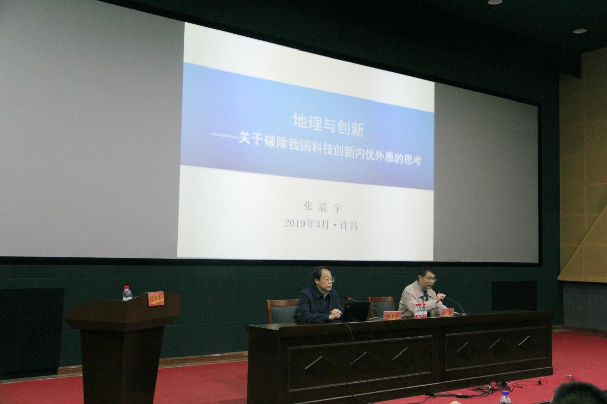 3月29日下午,全国政协常委、民进中央常委、河南省委主委、河南省政协副主席张震宇教授应邀到bet36体育在线作了主题为《地理与创新——关于破除我国科技创新内忧外患的思考》的专题报告。bet36体育在线信息工程学院、城乡规划与园林学院师生200余人听取报告。副院长郑直主持报告会。
