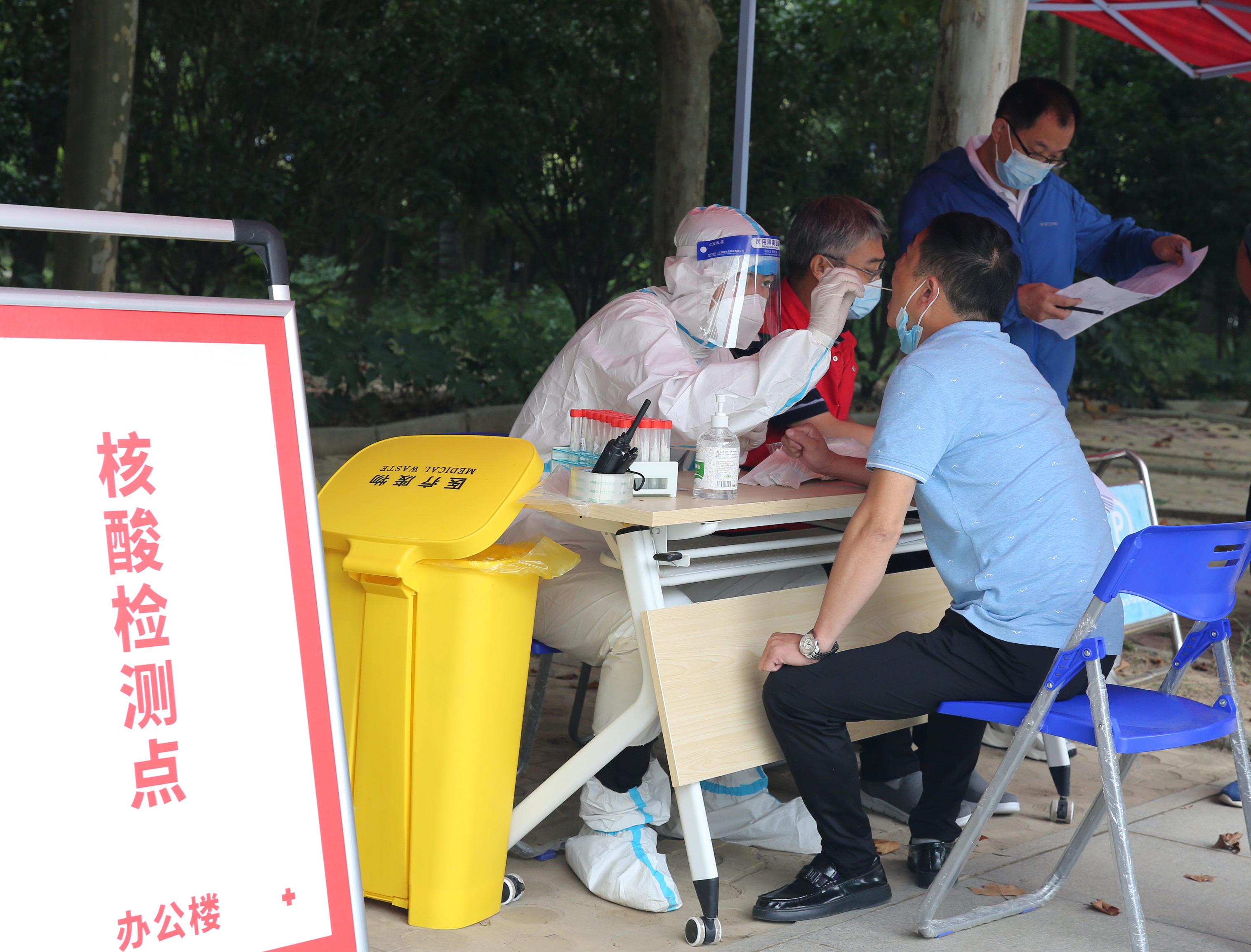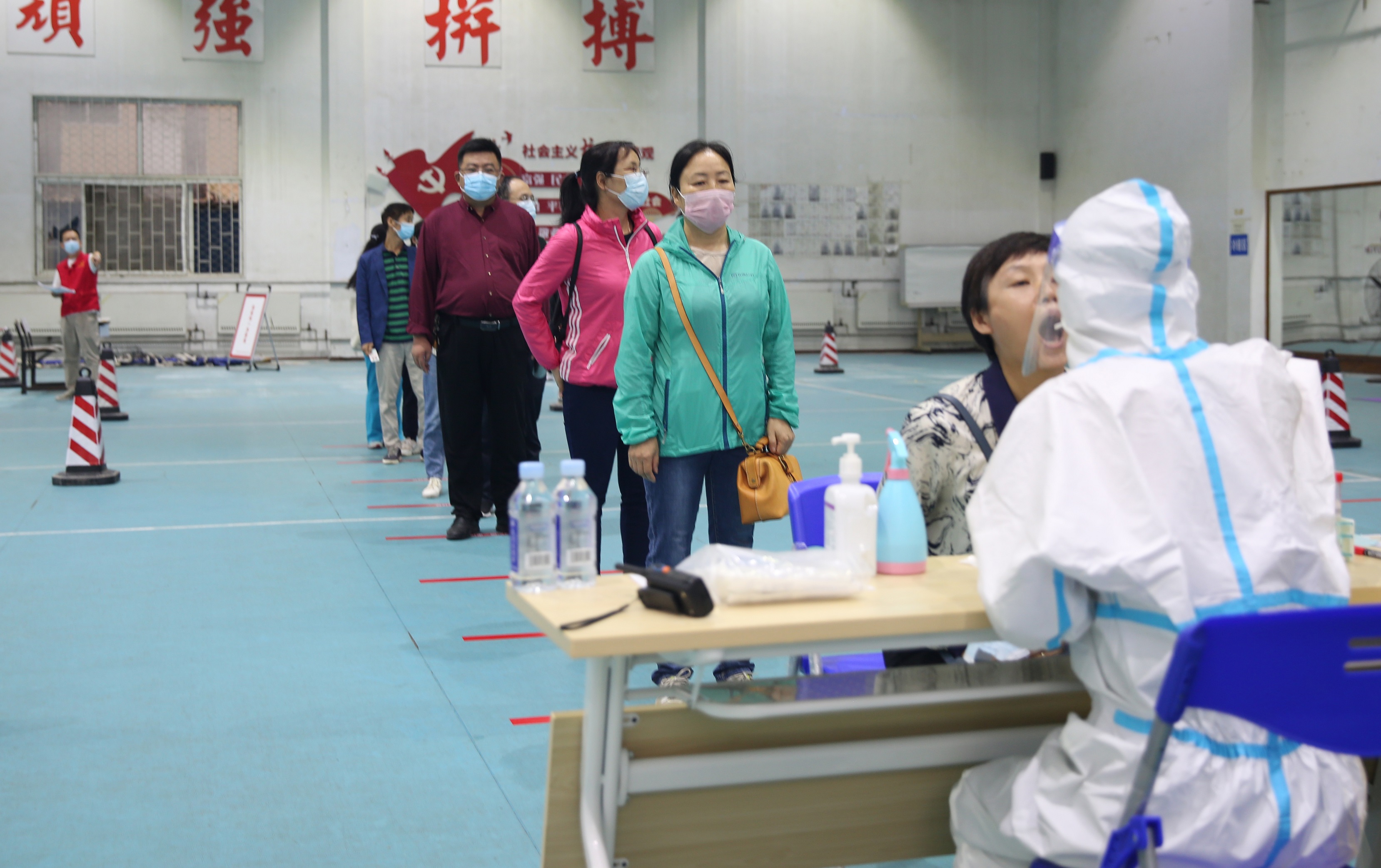 文科综合楼、体操馆、办公楼、满庭芳餐厅设立4个检测点,全体教职员工分5组进行核酸检测。检测现场严格落实疫情防疫要求,拉好隔离带、设置一米线和进出专用通道,依次排开的等候区、信息确认区、采样区等布置有序、准备充分;教职员工在志愿者们的指挥下分时段﹑分批次陆续进入等候区,按照指引进行咽拭子采集,检测过程快捷高效,井然有序。