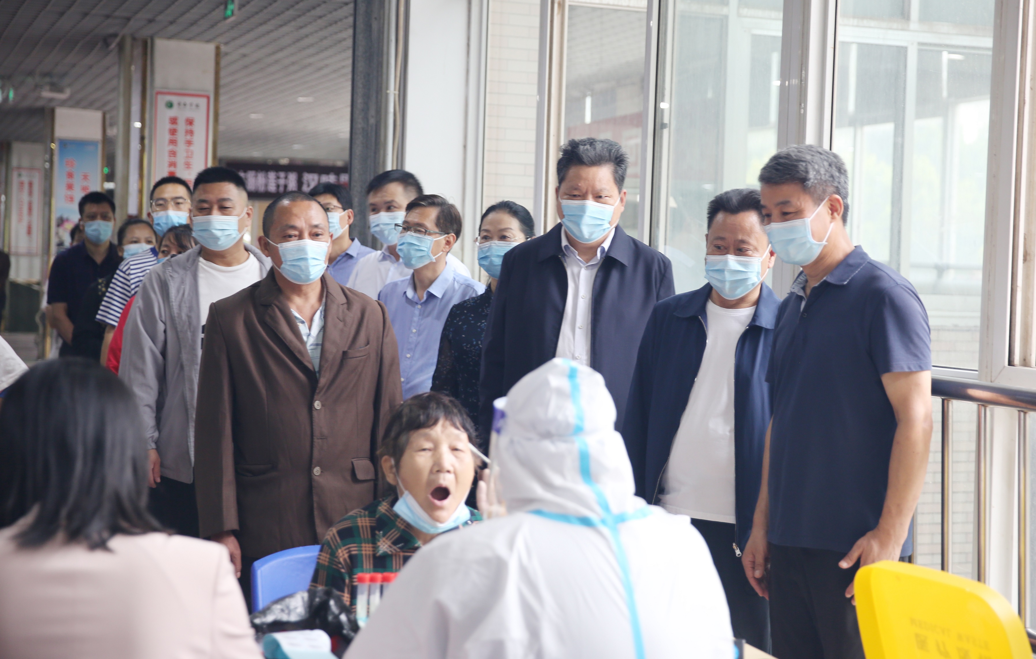 校党委书记闫纪建,院长岳修峰,党委副书记孙海,副院长高金星、潘春彩,纪委书记王东晓到各个检测点检查指导工作,向医护人员和志愿者表示慰问、感谢,希望大家在做好自我保护的同时努力工作,齐心协力完成好本次全员检测。