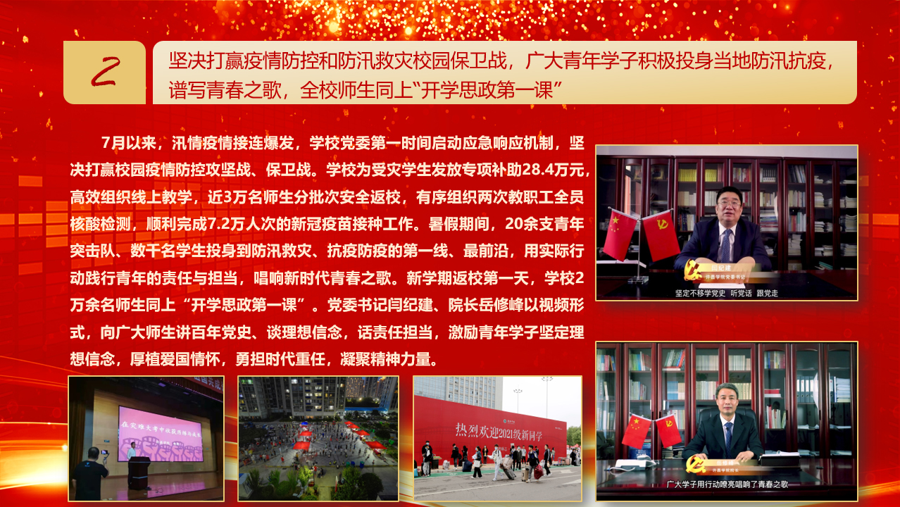 2021年是中国共产党成立100周年,也是“十四五”规划开局之年。一年来,学校坚持以习近平新时代中国特色社会主义思想为指导,守正创新抢抓机遇,锐意进取开辟新局,各项事业蓬勃发展,取得一系列可喜成绩。为集中宣传展示一年来的办学成就,进一步凝聚力量,鼓舞斗志,党委宣传部(新闻中心、校报编辑部)组织开展了bet36体育在线2021年度十大新闻事件评选活动。经过初选推荐、纸质投票、网站及官微投票、征求各层面意见等环节,最终确定了入选名单,现予以发布。