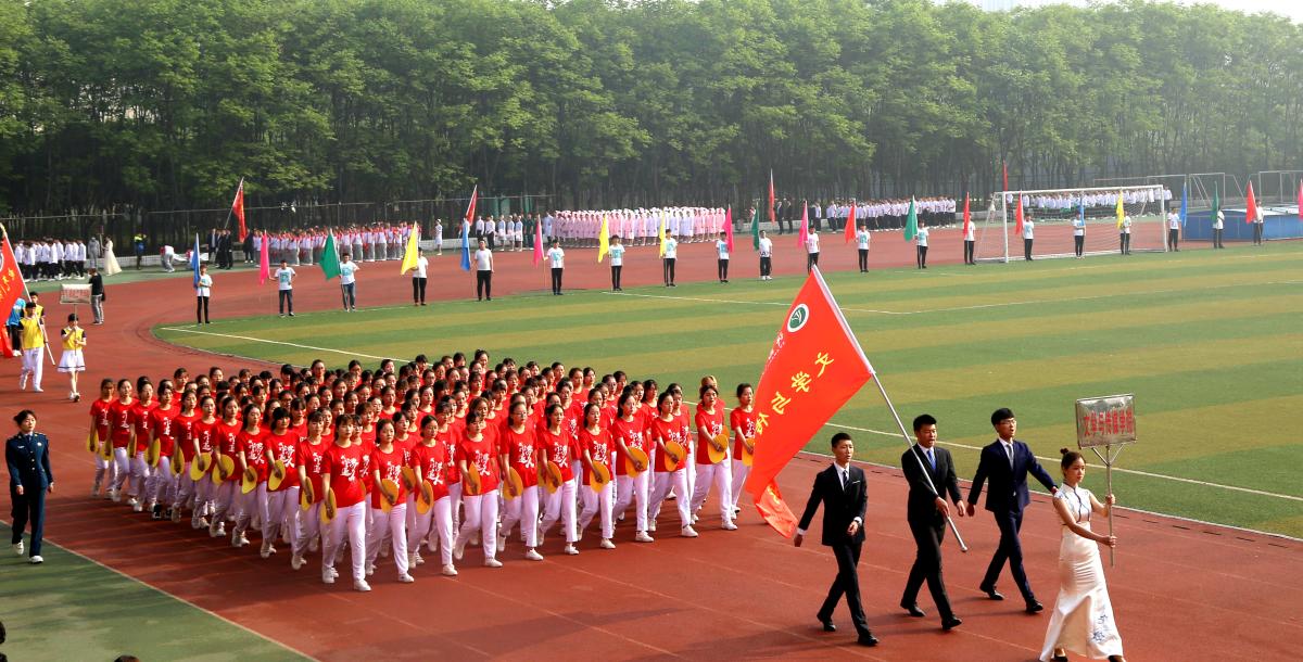 上午8时,伴随着雄壮激越的《运动员进行曲》,全体裁判员、运动员在校旗、第十六届田径运动会会徽和彩旗方队的引导下入场。