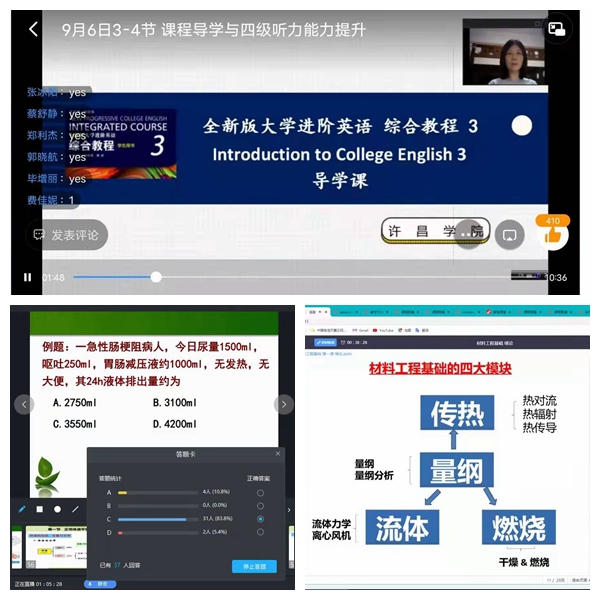 电气与机械工程学院第一时间召开线上教学会议,提前购置电脑、手机支架、书写板、千兆路由器等多种设备,打造居家“讲台”;提前摸底,精心挑选适合学生的直播平台并做好意外预案,确保直播“不掉线”。教育学院组织现代教育技术专业教师,整理编写在线教学技术指南,为全院教师解答疑惑。土木工程学院以系、教研室为单位,开展线上教学经验交流与研讨,手把手指导新进教师,进一步提升线上教学质量。外国语学院以BOPPPS有效教学法为主,多种教学方法有效组合使用,借助直播软件和在线课程的投票、抢答、随堂练习等功能,让课堂活起来。