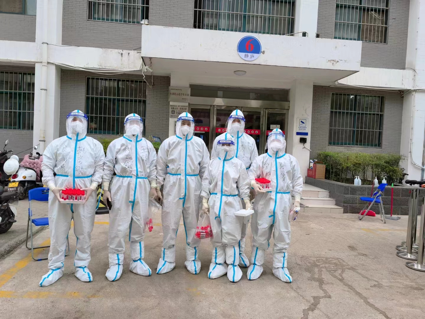 每天早晨6:00,穿着防护服、拿着采集管的“大白”志愿者2人一组,准时出现在各个宿舍门口,配合医护人员做好样本采集工作。