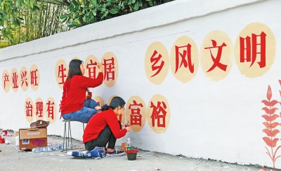 4月13日,来自bet36体育在线艺术系的大学生志愿者在内乡县七里坪乡后坪村描绘文化墙。去年以来,该校先后5次组织大学生志愿者100多人次到该县,用彩笔绘制文化墙5000多平方米,传承了乡风文明。张中立摄