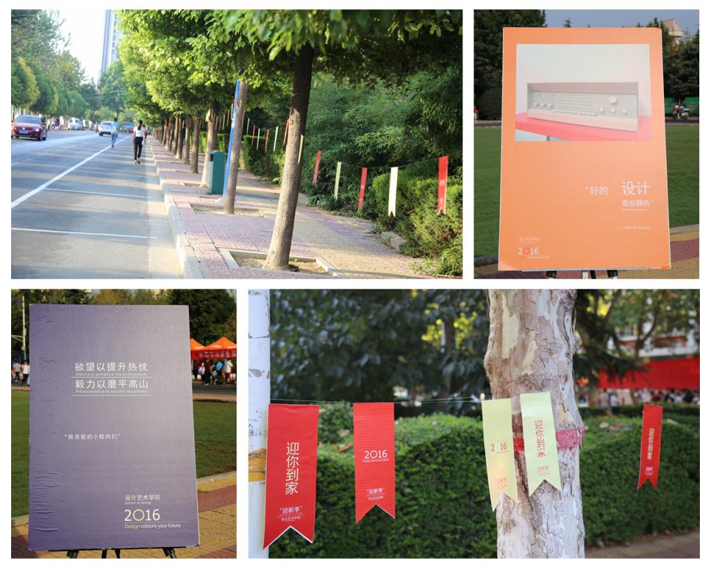在学校大门通往设计艺术学院的路上,每隔一小段路程就树立着颇有“设计艺术”范的海报展架,道路两旁飘扬着清新雅致的卡片,“迎你到家”四个小小的字散发着大大的温暖。马克思主义学院“高端大气上许院,低调奢华到马院”的横幅也显得格外惹眼。音乐舞蹈学院迎新帐篷前的小型演唱会,也给等待的新生送去了不少欢乐。