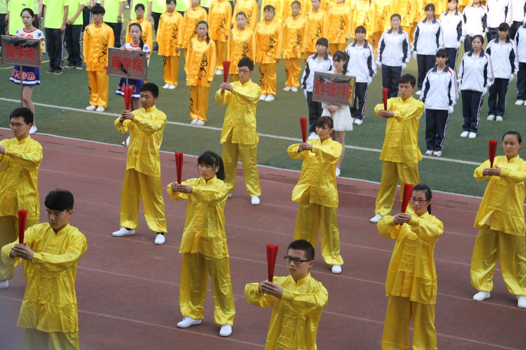 开幕式上,各院部代表队进行了武术健身操“英雄少年”的比赛。