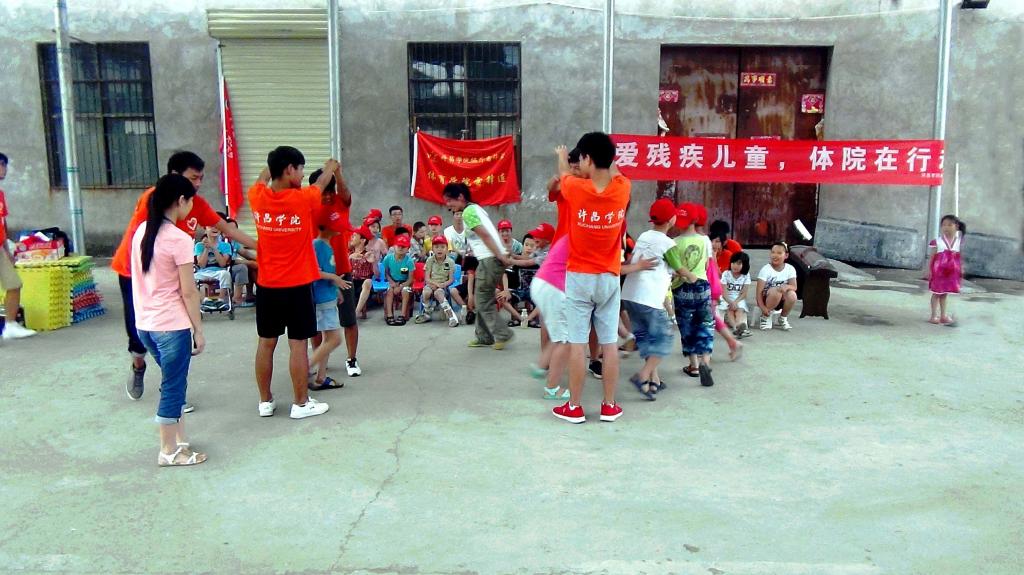 指导下,对孩子们进行动作协调、体肌张力等方面的训练,帮助孩子们学习如何完成指定任务。同时,队员们在对孩子们进行康复训练之余,还教孩子们识字,认数,简单的手工制作,与孩子们一起唱儿歌、做游戏。孩子们热情高涨,队员们认真负责,大家其乐融融。