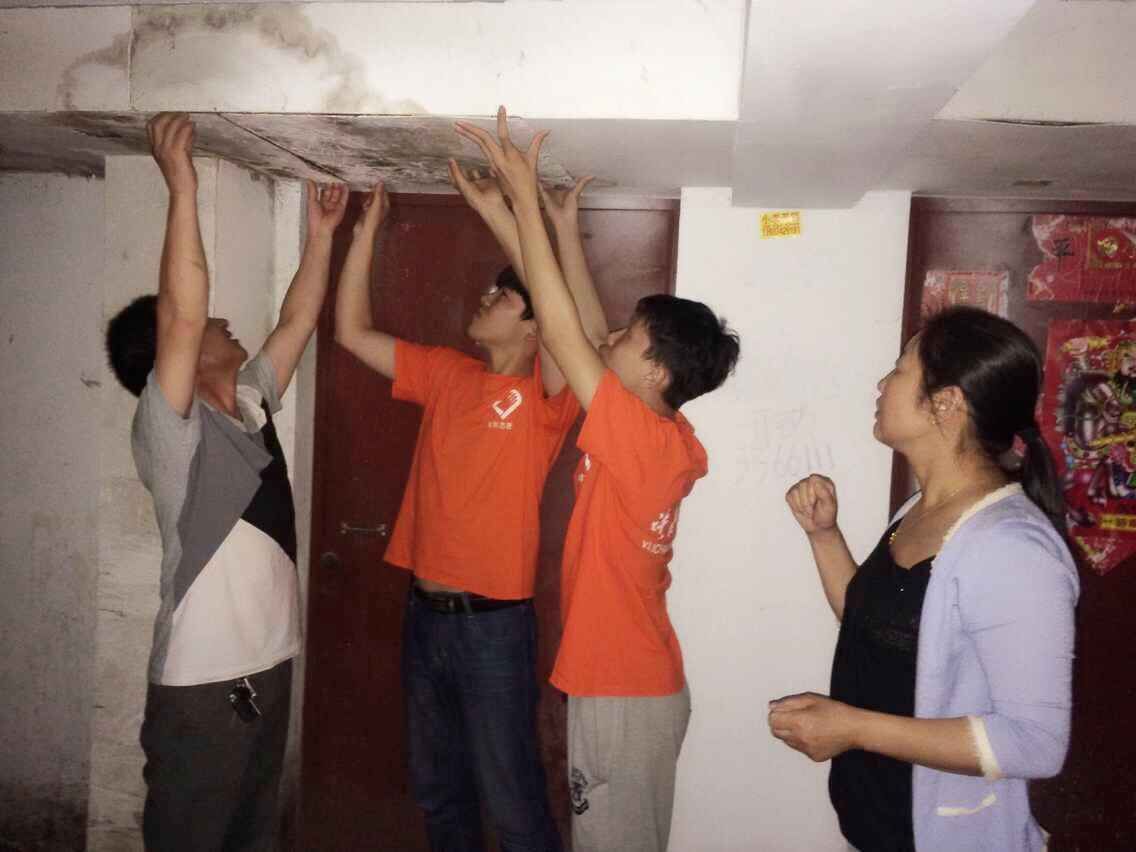 一进社区,队员们在得知孤寡老人赵大爷家地下室年久失修,屋顶房檐多处被水侵蚀掉,一下雨就渗水的情况后,第一时间配合社区干部准备维修