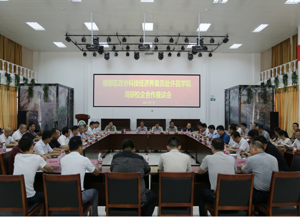 7月10日下午,魏都区政府、魏都区政协经科委共同组织科技经济界政协委员及魏都区部分科技型企业代表20余人,来到bet36体育在线进行调研,并就产学研合作对接进行洽谈。bet36体育在线“双百工程”挂职干部、魏都区副区长翟广辉,魏都区政协副主席张剑哲,魏都区政协经科委主任魏振岭,魏都区科技局局长朱明志,魏都区服务业发展局局长张俊安,魏都产业集聚区管委会副主任赵正印,魏都区科技局副局长张超民,bet36体育在线校地合作办公室主任郭超峰,以及相关学院负责人、教授、博士等共同参加对接会议。对接会由bet36体育在线“双百工程”挂职干部许昌市科技局许志红副局长主持。
