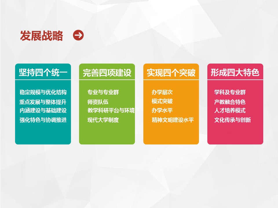 总规划明确提出今后五年的发展战略是“坚持四个统一、完善四项基本建设、实现四个突破、形成四大特色”,基本完成“三基一体”的建设任务,即五年内把学校建设成为高层次应用型人才培养基地、政产学研协同创新基地、先进技术转移与服务基地和高等教育、职业教育、继续教育有机联合体。实现发展战略的载体是“河南省示范性应用技术类型本科院校”建设和国家级“十三五”“产教融合发展工程应用型本科院校”建设。五年内事业发展的战略目标是初步建成以培养高层次应用型人才为核心,与区域重点产业、主导产业、特色产业和区域文化高度融合,特色鲜明的高水平应用技术大学。
