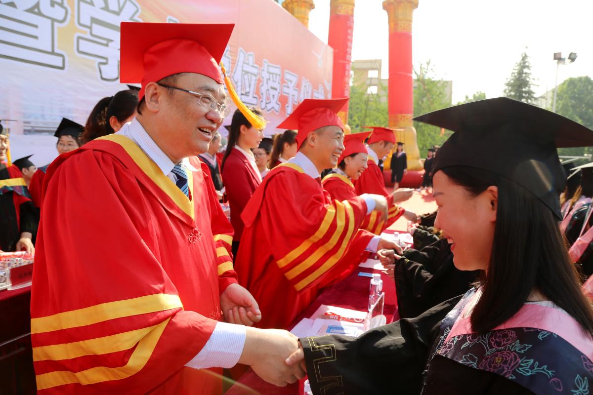 6月12日上午,bet36体育在线在弘毅广场举行2019届毕业典礼暨学位授予仪式。5452名2019届本科毕业生被授予学士学位。胡康等134名同学被授予省级优秀毕业生荣誉称号,丁畅等654名同学被评为校级优秀毕业生,另有388名考取硕士研究生的学生受到表彰。党委书记闫纪建、院长岳修峰等学校领导和学校学士学位评定委员会委员,为毕业生授予学位证书,并为他们拨穗正冠。