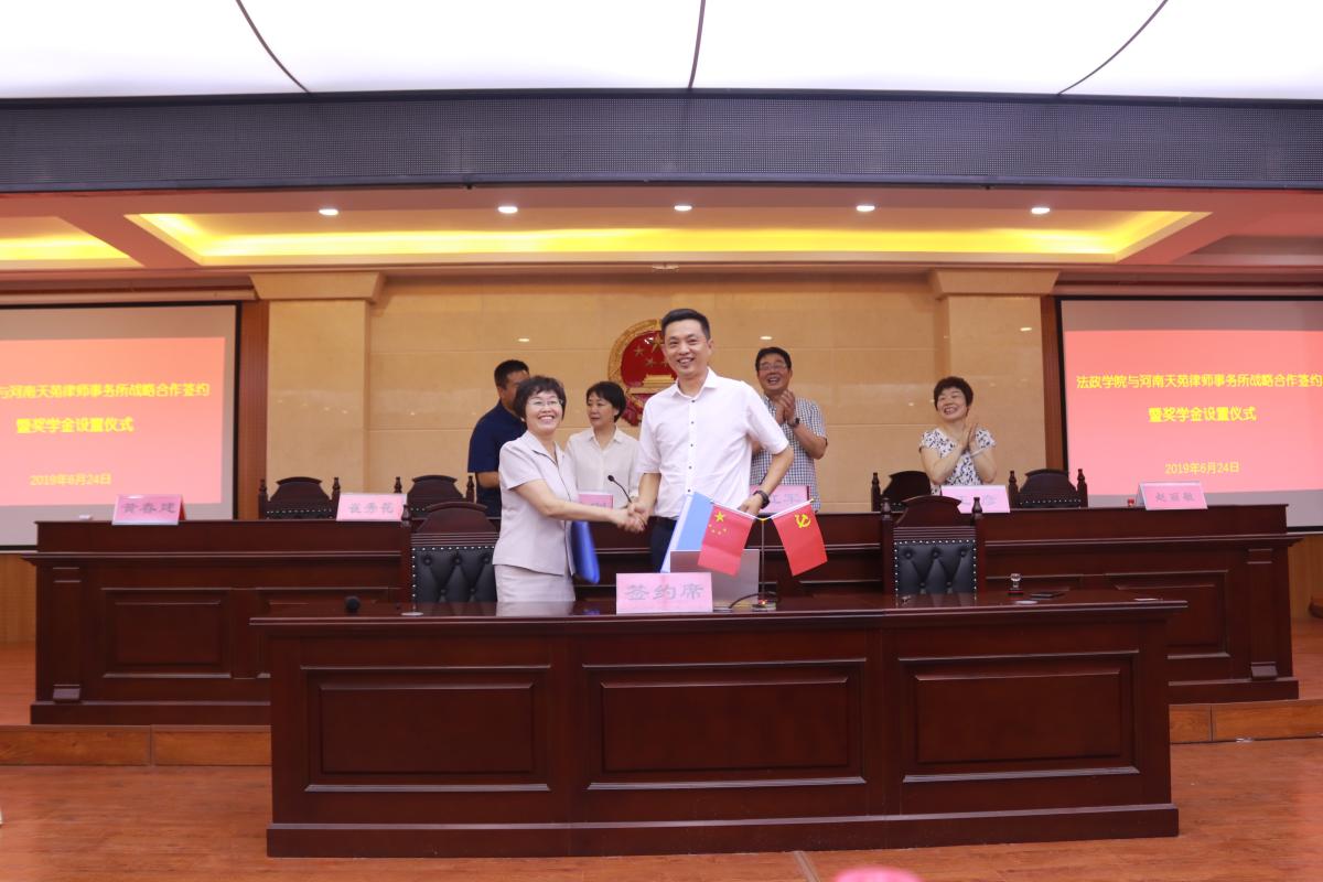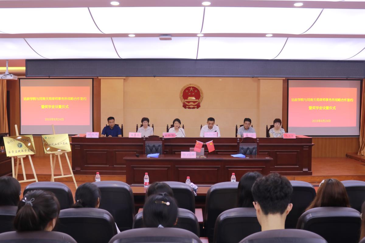 6月24日上午,bet36体育在线法政学院与河南天苑律师事务所在C合二模拟法庭举行战略合作签约暨奖学金设置仪式。副院长黄怡俐、河南天苑律师事务所主任马红军出席会议,党委宣传部、法政学院等相关负责同志及法政学院全体师生参加了签约仪式。