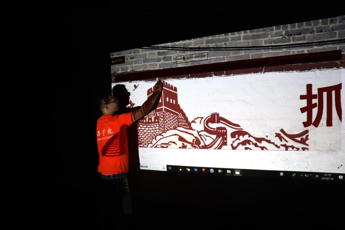 连日来,实践队员们结合自身专业特点,通过在袁庄村进行调研考察、数据测量、场地整理等筹备工作,已初步完成了袁庄村规划馆的草图设计和村道墙绘的整体安排,CAD图纸绘制工作也正式开启。实践队员们顶着烈日,用辛勤的劳动和手中的画笔,令袁庄村的村容村貌焕然一新。与此同时,实践队员们已完成5面墙体的彩绘工作,将扶贫政策通过生动多彩的宣传画传递到村民心中。