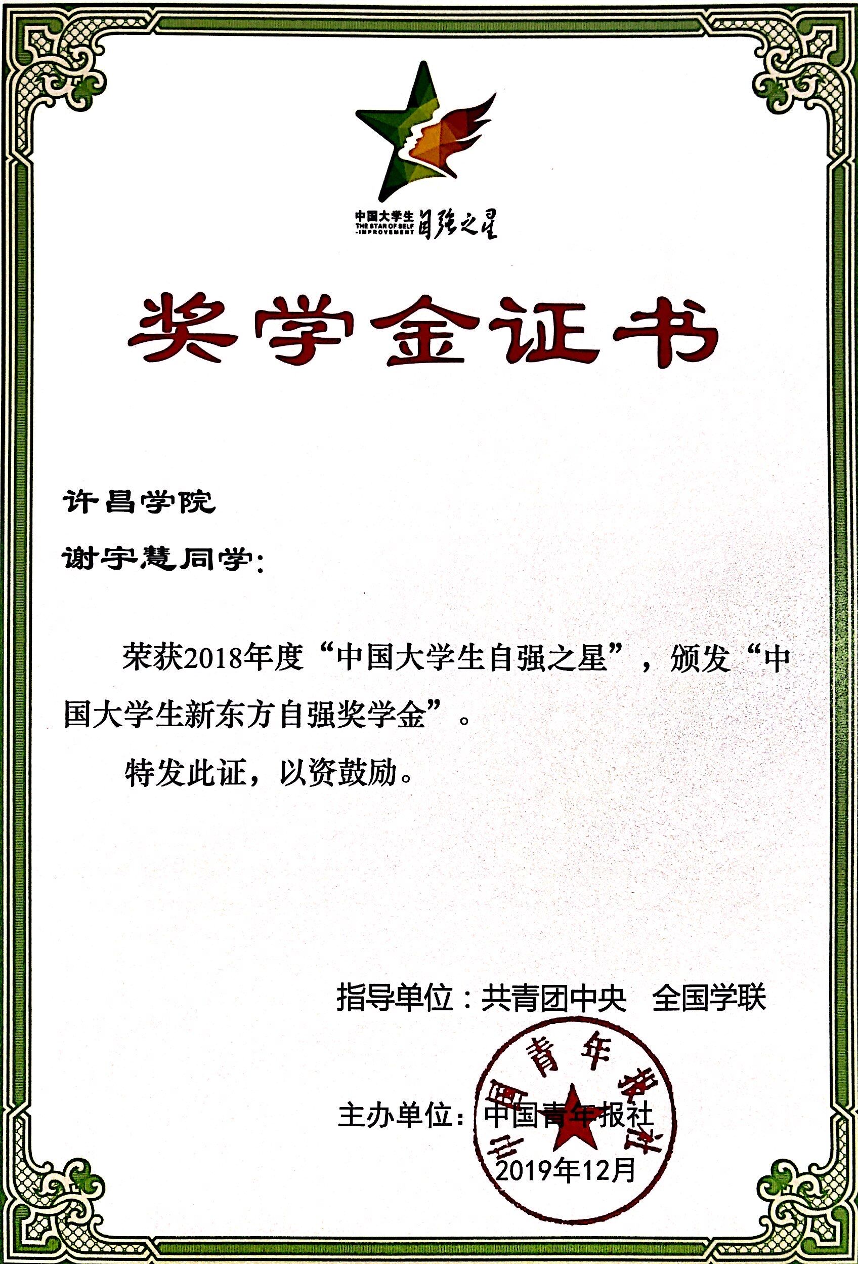 近日,由共青团中央、全国学联联合主办的2018年度寻访“中国大学生自强之星”活动评选结果揭晓,bet36体育在线信息工程学院谢宇慧、数学与统计学院赵明明两名同学,经学校推荐、省级初评、全国评审等环节,双双荣获“中国大学生自强之星”称号,并获得“中国大学生新东方自强奖学金”。