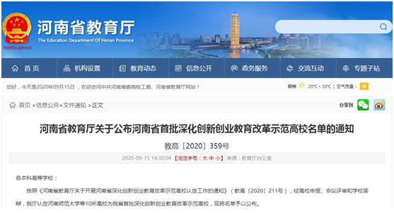 9月15日,河南省教育厅发布《关于公布河南省首批深化创新创业教育改革示范高校名单的通知》(教高〔2020〕359号),bet36体育在线荣获“首批深化创新创业教育改革示范高校”。